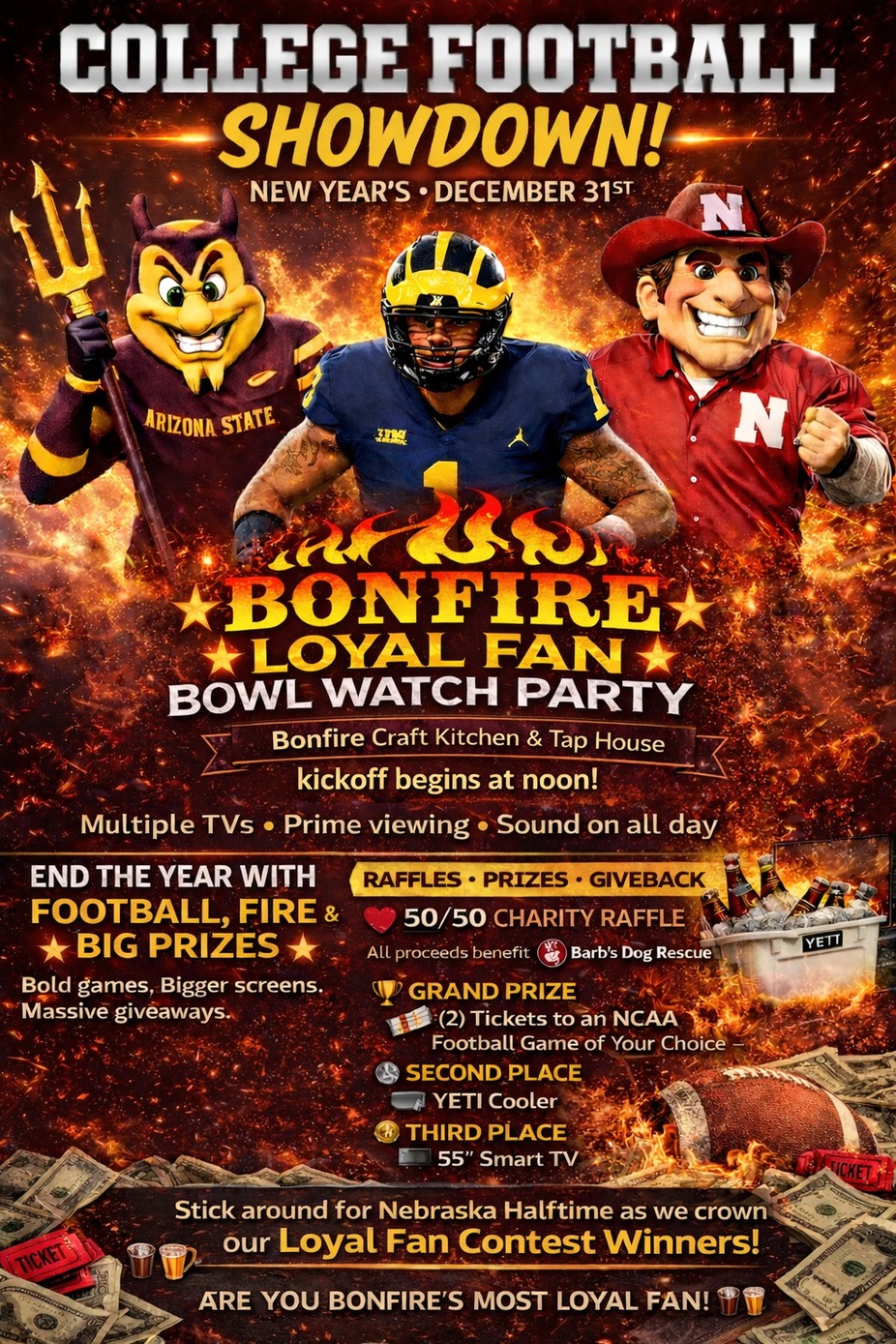 This New Year's Eve join us at Bonfire for a day of bowl games with all of our favorite teams!! Starting at noon our ASU Sun Devils take on Duke in the Sun Bowl, then at 1:00 Michigan and Texas meet up for the Citrus Bowl and finally at 1:30 our favorite Huskers go at it against Utah in the Las Vegas Bowl. Make sure to stick around for 50/50 raffles, prizes, and the Loyal Fan Contest drawing during the Huskers half time where we choose the winner of BONFIRES LOYAL FAN CONTEST!!! You don't want to miss out on the last few days of football we have left!!