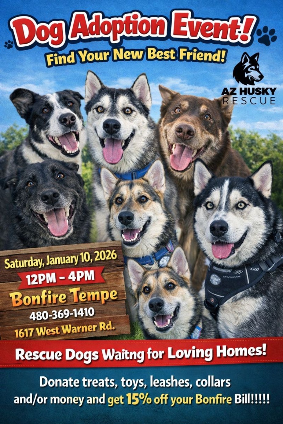 Stop by this Saturday to meet your new furry friend!!! Bonfire has teamed up with AZ Husky Rescue for our annual adoption event where plenty of fur babies will be available for you to bring home! Bring in items for donation such as leashes, toys, collars, beds, treats, etc. and also receive an additional 15% off your bill! Let's get these babies out of the shelter and into their forever homes!! See you Saturday!